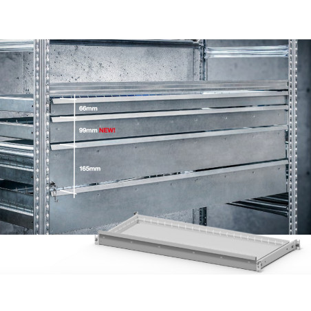 Zásuvky jsou ideální pro skladování drobného materiálu, náhradních dílů, výkresů i kancelářských potřeb. Skvěle se hodí nejen do dílen, skladů a servisních středisek, ale také do kancelářských prostor. V kombinaci s regálovou konstrukcí lze vytvořit zásuvkové skříně, přičemž zásuvky mohou být na přání opatřeny zámkem pro vyšší úroveň zabezpečení.